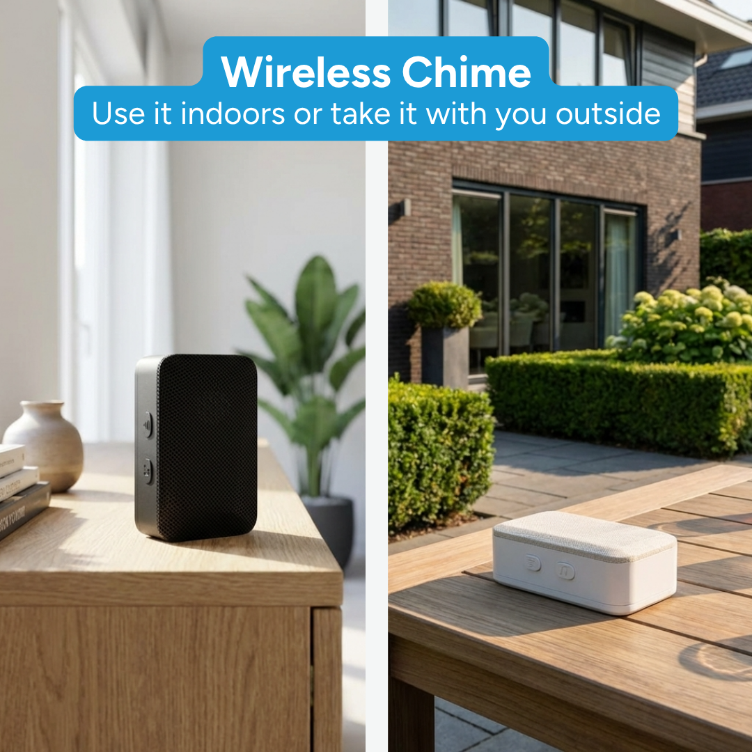 De draadloze deurbelgong werkt op 3 AAA-batterijen, heeft 20+ melodieën, instelbaar volume en werkt tot 25 meter afstand. Meerdere gongen koppelbaar.